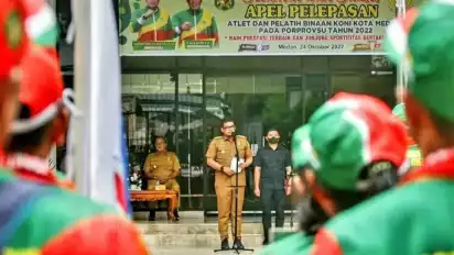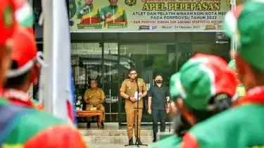 Medan, Sumatera Utara - Wali Kota Medan dan jajarannya, bersama Ketua KONI Kota Medan resmi melepas atlet dan pelatih sebanyak 329 Kontingen Kota Medan yang akan bertanding di perhelatan Pekan Olah Raga Provinsi Sumatera Utara (Porprovsu) Tahun 2022 di halaman tengah Balai Kota Medan, (24/10/2022).