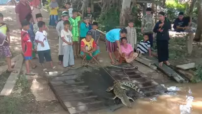 Sontak, buaya yang ditangkap warga sempat menjadi tontonan warga sekitar pada siang harinya untuk melihat sesosok hewan yang hidup di dua alam itu.