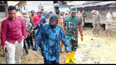 Setelah menyerahkan bantuan, selanjutnya Risma beranjak meninjau lokasi banjir bandang di Desa Rambung Teldak serta melihat secara langsung rumah warga yang hancur, jalan dan jembatan yang putus serta lahan pertanian milik warga yang rusak.
