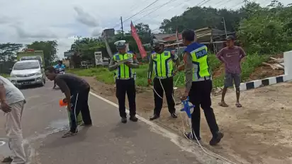 Saat ini pihak kepolisian Unit Lakalantas Polres Musi Banyuasin masih melakukan olah tempat kejadian perkara, mencari penyebab truk tronton yang menabrak korban ibu dan anak hingga tewas di tempat (Pka/Nof)
