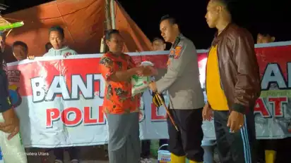 Melihat kondisi tersebut, Kapolres Langkat AKBP Danu Pamungkas Totok langsung mengecek lokasi yang terkena banjir dan memberikan bantuan beras di tenda darurat yang dibangun warga.