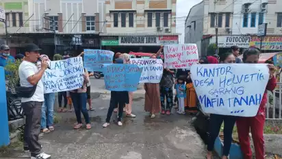Medan, Sumut - Merasa diserobot lahan tanahnya, puluhan warga Desa Helvetia geruduk Kantor Camat Labuhan Deli, Kabupaten Deliserdang, menuntut keadilan atas adanya dugaan mafia tanah di Desa Helvetia, Rabu siang (28/12/2022).