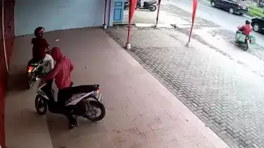 Dari kamera pemantau, dua orang terduga pelaku memakai baju berwarna merah menggunakan sepeda motor merk Scoopy perlahan mendekati sepeda motor tersebut.