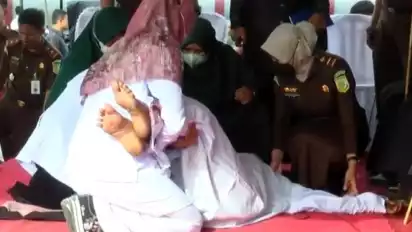 Aceh Barat, Aceh - Dihukum cambuk sebanyak 100 kali seorang wanita bernisial ER terpidana Qanun Aceh nomor 6 tahun 2022 tentang hukum jinayat jatuh pingsan, di halaman Lembaga Permasyarakatan Kelas 2B Meulaboh.