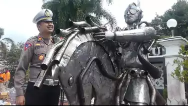 Bantul, tvOnenews.com - Sebuah patung penari kuda lumping yang terbuat dari ratusan knalpor brong sitaan petugas Satlantas Polres ditempatkan di samping taman Adipura Bantul Yogyakarta atau bersebarangan dengan Mapolres Bantul Yogyakarta.