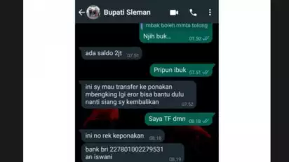 Pelaku mengirimkan pesan WA seolah Bupati Sleman dan meminta mentransfer sejumlah uang ke nomor rekening. Modusnya untuk diberikan kepada keponakannya.