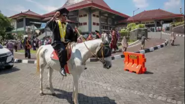 Sleman, tvOnenews.com - Seorang wisudawan Universitas Gadjah Mada (UGM) bernama Endra Harsaya (60) punya cara unik untuk merayakan kelulusannya. Saat para wisudawan lain datang mengendarai mobil, ia justru datang ke UGM dengan menaiki kuda.