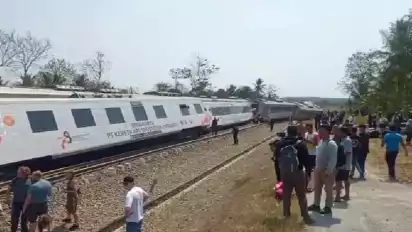 Dari pantauan tvOnenews, penumpang berhamburan dan rangkaian Kereta Api miring.