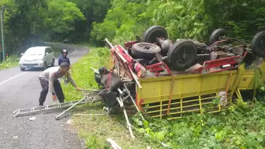 Bantul, tvOnenews.com - Truk colt bermuatan rangka tenda terguling pasca terlibat kecelakaan tunggal di Jalan Kaliurang, Dlingo, Kabupaten Bantul, Jumat (3/1/2025). Diduga, penyebab kecelakaan tersebut karena rem blong.