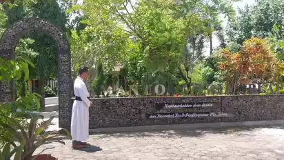 tvOnenews.com - Kesejukan alam dengan latar patung Bunda Maria berwarna keemasan yang ada di dalam biara di kampung Blotan, Wedomartani, Sleman Yogyakarta kini ramai dikunjungi wisatawan maupun para jemaatnya.