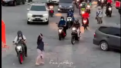 Wisatawan perempuan itupun sempat diklakson hingga nyaris ditabrak pengendara. Si wisatawan itupun terlihat berlari kecil menepi sambil ditarik oleh rekannya.