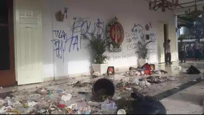 Yogyakarta, tvOnenews.com - Usai demo, massa aksi penolakan UU TNI mencoret-coret tembok gedung DPRD DIY, Kamis (20/3/2025). Selain itu, massa juga membawa plastik berisi sampah kemudian membuang dan menyebarkannya di teras gedung wakil rakyat tersebut.