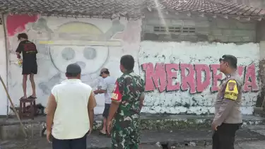 Penghapusan mural One Piece oleh pemuda di Dusun Temulawak, Kalurahan Triharjo, Sleman dengan dipantau oleh babinsa, bhabinkamtibmas serta dukuh setempat, Kamis (7/8/2025).