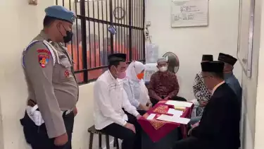 Bantul, Yogyakarta - Seorang tahanan di Polres Bantul Yogyakarta dalam kasus pencurian MMA (22), warga Pandak Bantul melangsungkan akad nikah, menikahi pujaan hatinya, VDO (27) yang juga warga Pandak Bantul depan ruang tahanan tepatnya di ruang Sat Tahti Polres Polres Bantul, Rabu (28/9/2022).