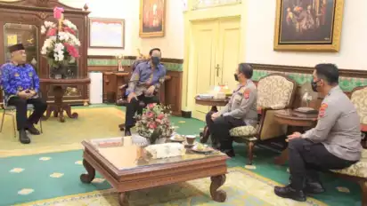 Yogyakarta, DIY - Setelah resmi dilantik sebagai Kapolda DIY, Irjen Suwondo Nainggolan langsung mengunjungi Gubernur DIY Sri Sultan Hamengku Buwono X. Kapolda datang bersama pejabat lama, Irjen Asep Suhendar yang saat ini sudah memasuki masa pensiun.