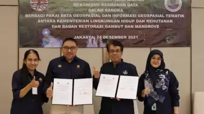 Jakarta - Badan Restorasi Gambut dan Mangrove (BRGM) bersama Kementerian Lingkungan Hidup dan Kehutanan (KLHK), melalui Direktorat Jenderal Planologi Kehutanan dan Tata Lingkungan KLHK menandatangani dokumen Kesepakatan Mekanisme Keamanan Data dalam rangka Berbagi Pakai Data Geospasial (DG) dan Informasi Geospasial Tematik (IGT), dan pembahasan teknis integrasi SIGAP.