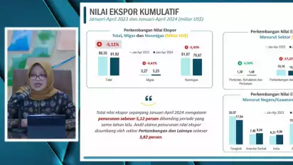 Lebih lanjut dia menjelaskan nilai ekspor Indonesia pada April 2024 mencapai 19,62 miliar dolar AS, atau turun 12,97 persen dibanding ekspor Maret 2024. Namun, dibandingkan April 2023, nilai ekspor naik sebesar 1,72 persen (yoy).