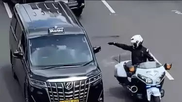 Setelahnya, polisi patwal yang memimpin rombongan sesaat memberhentikan motornya dan berhenti disamping taksi Alphard itu seraya melakukan penunjukan jari ke arah sopir.