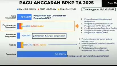 Dia menjelaskan, dalam Anggaran Pendapatan dan Belanja Negara (APBN) 2025 sebelumnya yang telah disetujui Komisi XI DPR RI, total pagu anggaran BPKP tercatat sebesar Rp2,473 triliun. Jumlah ini terdiri dari pagu yang berasal dari Rupiah Murni sebesar Rp2,285 triliun, PNBP (Penerimaan Negara Bukan Pajak) sebesar Rp76,39 miliar, dan PLN (Pinjaman Luar Negeri) sebesar Rp112,14 miliar.