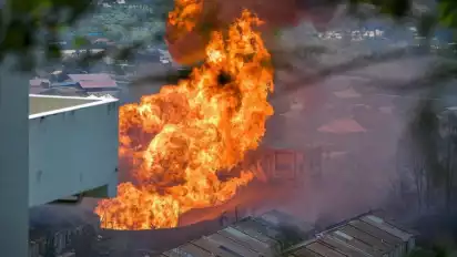 Dentuman keras diikuti kobaran api raksasa setinggi 20 lantai membuat langit di kawasan itu berubah merah membara. Insiden ini menyebabkan 112 orang mengalami luka-luka, sementara puluhan rumah rusak akibat tekanan ledakan.