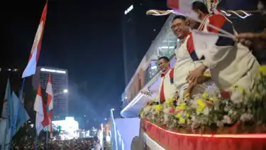 Momen menarik terjadi ketika kapal pinisi melintas di depan panggung utama karnaval. Presiden Prabowo tampak berjoget dengan antusias, disambut sorak riuh masyarakat di sepanjang jalur pawai.