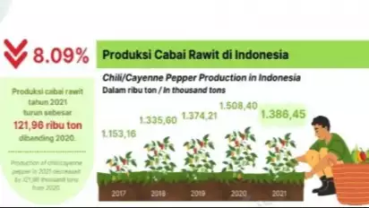 "Produksi cabai rawit tahun 2021 mencapai 1,39 juta ton, turun sebesar 8,09%