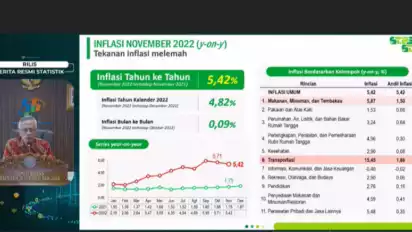 Jakart - Badan Pusat Statistik (BPS) mencatat inflasi Indeks Harga Konsumen (IHK) pada November 2022 menurun secara tahunan dari 5,71 (year-on-year/yoy) menjadi 5,42 persen (yoy).