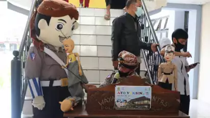 Purbalingga, Jawa Tengah - Selalu ada cara agar anak-anak bisa rileks saat mengikuti vaksinasi Covid-19. Salah satunya yang dilakukan Satlantas Polres Purbalingga, dengan menghadirkan badut polisi bernama Si Braling dan wayang lalu lintas.
