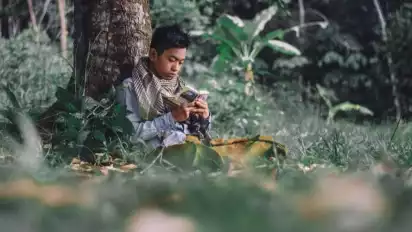 Ilustrasi seorang pria membaca Al-quran sembari berpuasa saat bulan Ramadhan