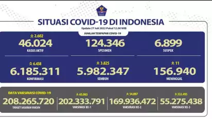Jakarta - Kasus baru COVID-19 di Indonesia pada Rabu (27/7/2022) bertambah 6.438 kasus sehingga total jumlah positif per hari ini menjadi 6.185.311 kasus di seluruh Indonesia.