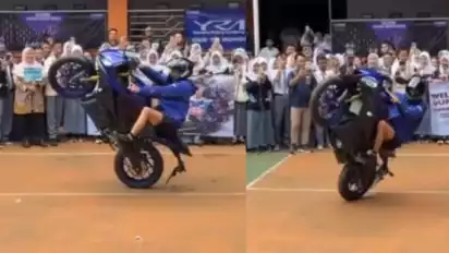 Toprak bahkan melakukan sejumlah atraksi menggunakan Yamaha R25, mulai dari wheelie hingga burnout di lapangan sekolah.