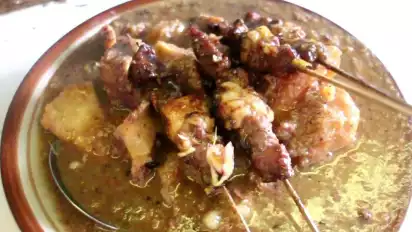 “Ini petis balungan sapi, kalau satenya ya tetap daging sapi. Lebaran kemarin ramai full sampai 5 panci, belum yang pesanan pesanan. Seribu tusuk sate ya habis satu hari, belum kalau ada pesanan. Setiap hari buka, kalau ada pesanan ya tetap buka,” ujar Bu Lasjan.