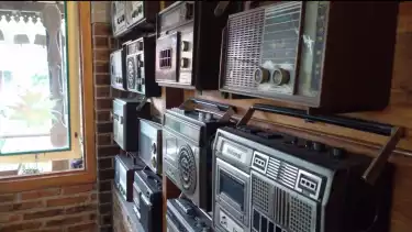 Mesin ketik berusia tua, kaset pita memenuhi salah satu dinding, radio jadul. Lalu ada lukisan media kayu vintage. Dan aneka pernik keramik hingga mainan jadul dari logam dipajang.