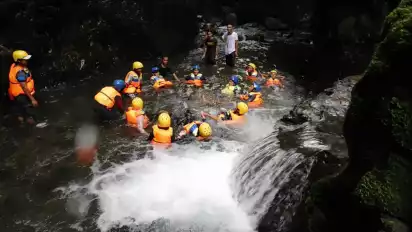 Bersama teman sekelompok, kita bisa melakukan aktifitas sederhana namun seru di sungai, seperti perang cipratan air, atau membuat formasi lingkaran di kolam jeram yang agak dalam.