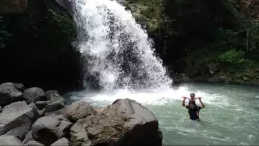 Dari kebun cengkeh, mlipir di jalur irigasi, menyeberang sungai berair bening, menembus hutan, hingga trekking di jalur setapak. Butuh waktu sekitar satu jam untuk sampai di air terjun. Panoramanya luar biasa, dengan ketingggian air terjunnya mencapai 40 meter.