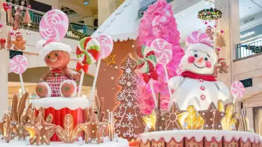 Plaza Senayan menjadi salah satu destinasi favorit untuk merasakan Natal yang elegan dan hangat. Tahun ini, dekorasi utama di lobby menghadirkan istana bertema ginger cookie house yang detail dan bisa dimasuki pengunjung. Warna pastel, pencahayaan lembut, dan ornamen manis membuat area ini menjadi spot foto favorit keluarga.