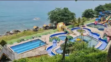 Lampung Selatan, Lampung - Kolam renang mungkin sudah biasa anda nikmati, tapi merasakan sensasi waterpark yang berhadapan dengan pemandangan laut Selat Sunda yang membentang, menjadi pengalaman baru bagi anda yang ingin mencoba wahana waterpark di Krakatau Kahai Beach, Kabupaten Kalianda Lampung Selatan, tepatnya di Desa Rajabasa.