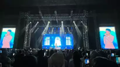 Saat di tengah-tengah nada, ia tampak memegang dadanya lantaran gugup mendengar sorakan dari fans yang memenuhi area fan meeting.