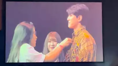 Reaksi fans lain yang melihat pun seketika membuat ruangan fanmeeting penuh teriakan iri.
