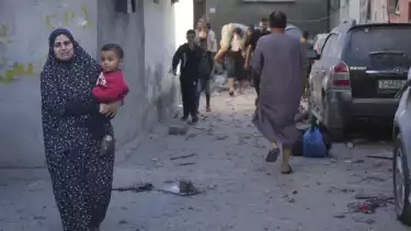 Seorang wanita di Kota Gaza membawa seorang anak di tengah kondisi perang. (AP Photo)