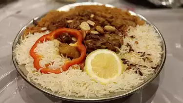 Tersaji dengan komponen jeruk lemon, paprika merah, potongan daging unta berada di tengah-tengah nasi khas timur-tengah itu terlihat kurang lebih seperti daging sapi, cokelat dari lumuran bumbu dan dagingnya terlihat agak lebih gelap.