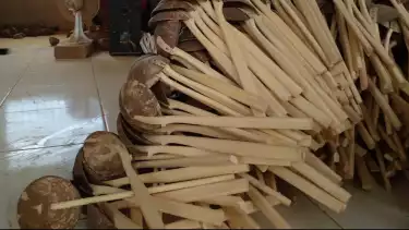 "Kita dapat dari industri bungkuk atau pengolahan kayu. Masih harus dihaluskan lagi tentunya," ujar Sutrisno, salah seorang perajin.