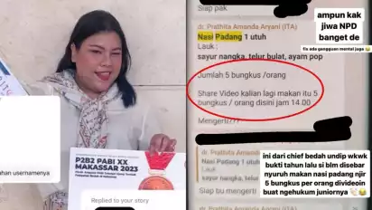 "Nasi padang 1 utuh. Jumlah 5 bungkus/orang. Share video kalian lagi makan itu 5 bungkus / orang disini jam 14.00. Mengerti???" tulis Prathita via WhatsApp yang tangkapan layarnya disebar luaskan lewat X.