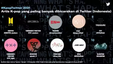 Grup idola K-pop Bangtan Sonyeondan (BTS) (@BTS_twt), menempati urutan pertama dalam daftar artis K-pop yang paling banyak dibicarakan secara global. Konser mereka bertajuk "PERMISSION TO DANCE ON STAGE - LA" yang diselenggarakan secara langsung, berkontribusi terhadap lebih dari 68 juta Tweet di secara global.