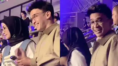 Desy tampil anggun dengan kerudung hitam dan blouse biru, dan terlihat berjalan berdampingan dengan Ruben saat mereka menuruni tribun untuk menuju barisan depan konser.