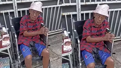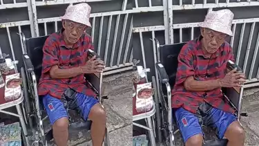 Dalam video tersebut terlihat Pak Tarno duduk di kursi roda sambil menjajakan ikan cupang dan mainan anak-anak di depan rumahnya.