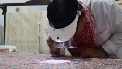 Petugas Museum Batik Pekalongan mengamati kain batik kuno