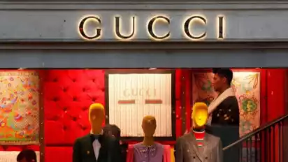 Logo Gucci tampak di luar sebuah toko di Paris