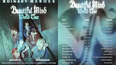 "Xdinary Heroes 〈Beautiful Mind〉 World Tour in INDONESIA. Xdinary Heroes will not only be visiting Jakarta, but also Surabaya for the #Beautiful_Mind_WorldTour_Indonesia! Villains Indonesia, get ready and we will see you in June!" tulis @mecimapro.