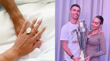 Dalam foto tersebut, terlihat tangan Georgina yang kini berhias cincin berlian berukuran jumbo, menggenggam erat tangan sang megabintang.